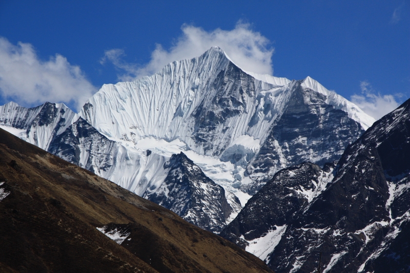 Les 2 premières journées de marche se déroulent entre 2 grandes montagnes en longeant la rivière Langtang Khola. Nous montons rapidement en altitude, un peu plus de 1000m de dénivelé positif par jour, c’est usant. Il n’y a pas de vues dégagées vers les hauts sommets, nous sommes la majorité du temps dans une forêt très calme où des rhododendrons de taille imposante colorent le paysage. Nous observons longuement des singes (langurs), des ruches géantes et de multiples oiseaux colorées. Après cette longue montée de 2 jours, nous continuons plus doucement pour arriver à 3800m d’altitude dans un village de type tibétain. Nous ressentons déjà le manque d’oxygène. Nous sommes sur des plateaux dégagées qui nous permettent d’admirer de hautes montagnes telles que Langtang Lirung (7234m) et Langtang II (6561m) ainsi que de beaux glaciers.