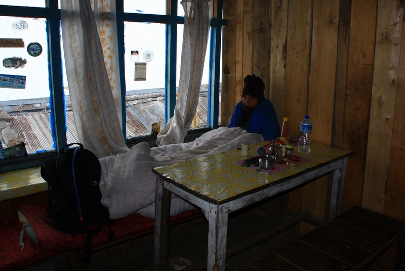Lors de cette ascension, nous avons eu un temps mémorable. Dés le début d’après-midi, les nuages s’emparent de la vallée, on ne voit qu’a quelques mètres, il fait très froid et il neige ou il grêle. Les lodges construits en bois ne sont pas isolés, le vent s’engouffre de partout et les népalais ne semblent pas savoir fermer les portes… Seule la pièce où nous mangeons est chauffée mais uniquement à partir d’une certaine heure et s’il fait suffisamment froid même pour un Népalais. L’attente devant le poêle éteint est parfois interminable. Une fois le feu allumé, nous restons collés au poêle, nous brulons devant et nous sommes gelés derrière. Dans les chambres c’est horrible, la température descend très facilement en dessous de 0, un touriste nous dira grâce à son thermomètre qu’il a fait -3°C. Ha ! Et petit détail, voulant porter le moins possible, nous n’avions pris qu’un seul duvet et Fred dormait avec les quelques couvertures mis à disposition dans les refuges, heureusement elles sont bien chaudes mais ne sentent pas la rose.