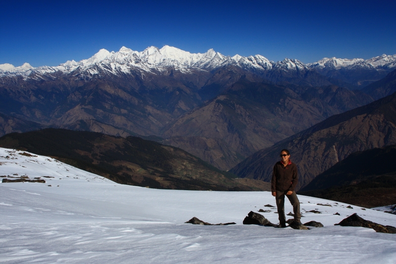 Ces petits moments de fraicheurs ont au moins eu l’intérêt d’enneiger toutes les montagnes au dessus de 3500m ce qui n’a fait que sublimer encore ces paysages magnifiques. De plus la vue était malgré tout extrêmement claire et dégagée de 7h à 14h ce qui nous laissait largement le temps d’en prendre plein les yeux. Quel bonheur de marcher dans la neige et sur la glace de bonne heure et couvert chaudement avant que le vent ne se lève. Lors de cette excursion, nous avons pu admirer d’impressionnantes vues sur Ganesh Himal (7406m), Manaslu et la fameuse chaine des Annapurnas. Nous avons même pu voir au loin un sommet de plus de 8000m.