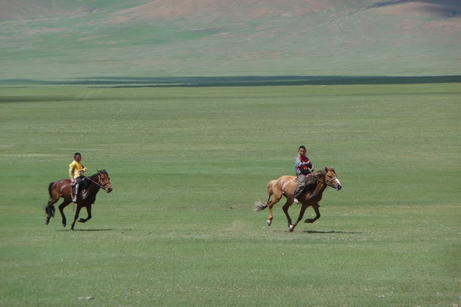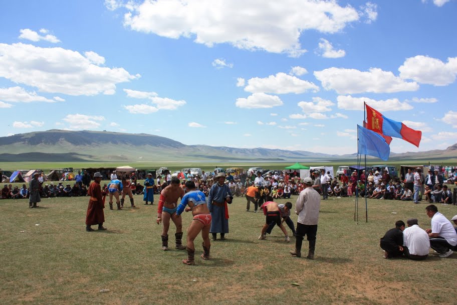 Nous prenons donc 3 heures de pause et assistons à une course de cheval et quelques matchs de luttes. Tout le monde nous affirme qu’il est beaucoup plus intéressant de voir ce genre de Naadam locaux plutôt que le grand à Oulan-Bator, où il y a trop de monde et où il est difficile de voir quelques chose de près. En attendant la fin de la course de cheval, nous mangeons dans une yourte et goûtons 2 plats typiques (nouilles frit et soupe de viande).
