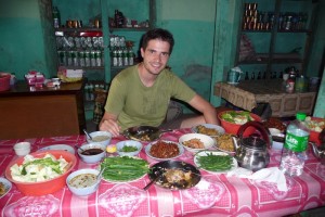 Le plat traditionnel du pays est le curry qui comporte de nombreux petits plats à volonté, une assiette de riz et parfois un petit peu de viande pas bonne et osseuse. Parmi les petits plats, seul 1 ou 2 sont à peu près bon, le reste se compose de poissons séchés ou marinés et de vieilles crudités mal lavées (il n’y a pas de frigo et pas d’eau potable). Les accompagnements que l’on a préférés étaient celui à base de poids chiches, les piments et la soupe de légume.
